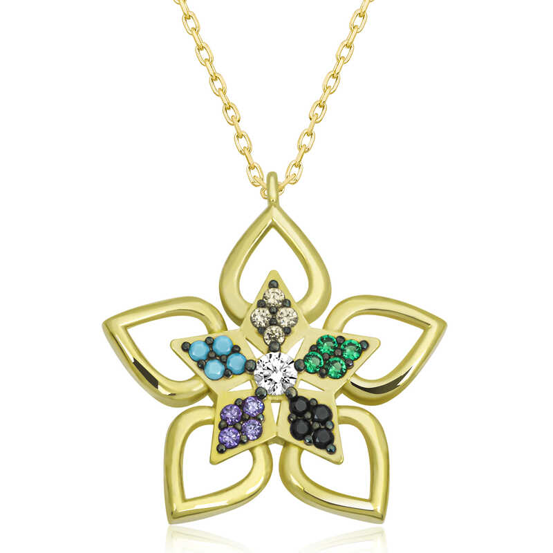 Silver Gold Colored Stone Flower Women's Necklace The most special and elegant way to express your feelings to your loved ones is to send her stylish, colorful and fragrant flowers. Flowers, which are among the gifts to be given on special occasions, have been designed with a different interpretation this time. The flower necklace with colorful stones is waiting for those who want to express their love once again, for those who want to say "you are a flower." This specially designed flower women's necklace is made of 925 sterling silver. Gold plated silver. Gold plated silver women's necklace models preserve their shine for a long time and oxidation is delayed. The stones on the necklace are zircon. Like all women's silver necklace models, the silver flower women's necklace is produced by hand. Due to silver and precious stones, there may be a ± 10% deviation in the specified product weight. Width: 2.00 cm Length: 2.20 cm Average Weight: 2.70 Gr Chain Length: 45 cm