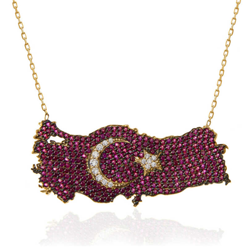 Silver Gold Crescent Star Turkey Map Women's Necklace We know that the Turkish flag was inspired by the crescent and star reflected in a lake of blood. We offer you an unmissable opportunity to carry the sacred meaning of the flag around your neck and share it with your loved ones. You can gift this stylish necklace to your loved ones on Mother's Day, Valentine's Day, birthdays or special days. This stylish necklace is made of 925 sterling silver. Gold plated on silver. All gold-plated silver women's necklaces preserve their shine for a long time. The necklace has a 45 cm long silver chain. Like all silver women's necklace models, the silver crescent star Türkiye map women's necklace is also handmade. Due to silver and precious stones, there may be a ± 10% deviation in the average product weight. Width: 4.30 cm Length: 1.90 cm Average Weight: 6.10 gr.