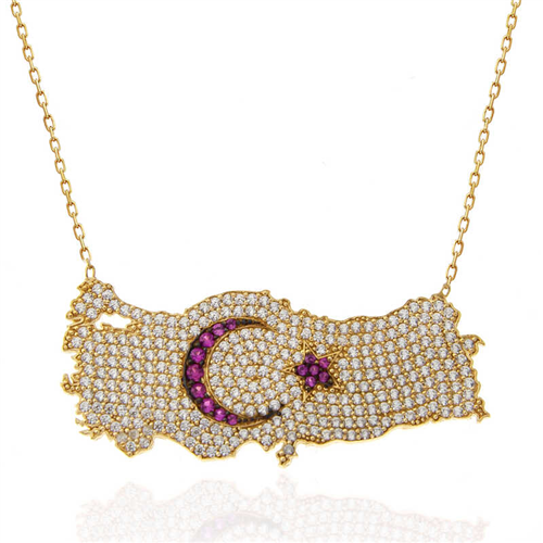 Silver Gold Crescent Star Turkey Map Women's Necklace We know that the Turkish flag was inspired by the crescent and star reflected in a lake of blood. We offer you an unmissable opportunity to carry the sacred meaning of the flag around your neck and share it with your loved ones. You can gift this stylish necklace to your loved ones on Mother's Day, Valentine's Day, birthdays or special days. This stylish necklace is made of 925 sterling silver. Gold plated on silver. All gold-plated silver women's necklaces preserve their shine for a long time. The necklace has a 45 cm long silver chain. Like all silver women's necklace models, the silver crescent star Türkiye map women's necklace is also handmade. Due to silver and precious stones, there may be a ± 10% deviation in the average product weight. Width: 4.30 cm Length: 1.90 cm Average Weight: 6.10 gr.