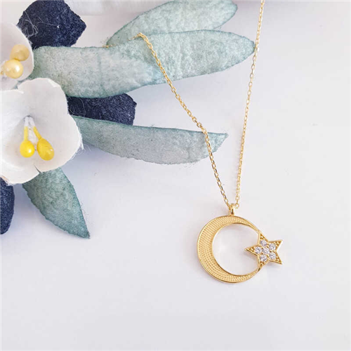 Silver Gold Crescent Star Women's Necklace We know that the Turkish flag takes its inspiration from the blood of martyrs and the crescent and star reflected in the bloodbath. This is an unmissable opportunity to carry the sacred meaning of the flag on your skin and share it with your loved ones. Crescent star necklace is made of 925 sterling silver. Gold plated on silver. Gold plated necklace models preserve their shine for a long time and oxidation is delayed. As with all necklace models, the crescent star women's necklace is produced by hand. Due to silver and precious stones, there may be ± 10% deviation in the average product weight. Width: 1.60 cm Length: 1.50 cm Avg. Weight: 1.50 gr.