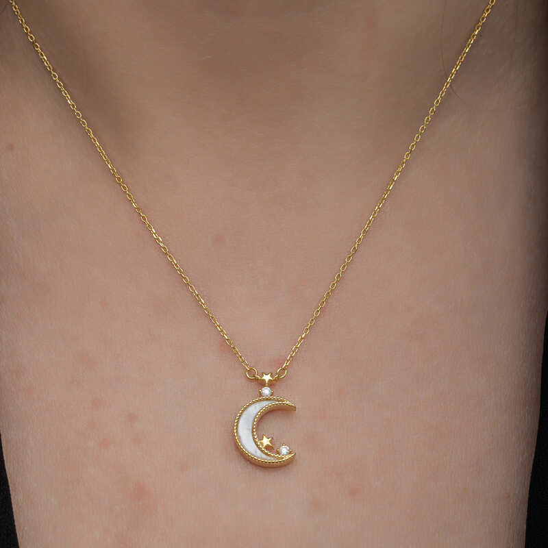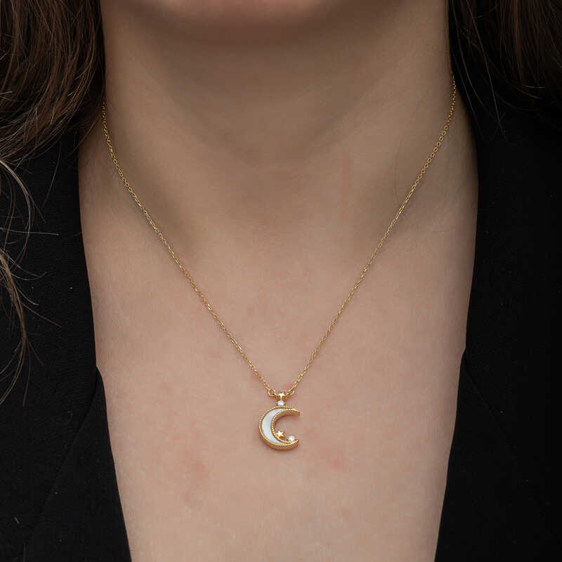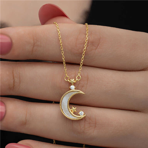Silver Gold Crescent Star Women's Necklace We know that the Turkish flag takes its inspiration from the blood of martyrs and the crescent and star reflected in the bloodbath. This is an unmissable opportunity to carry the sacred meaning of the flag on your skin and share it with your loved ones. Crescent star necklace is made of 925 sterling silver. Gold plated on silver. Gold plated necklace models preserve their shine for a long time and oxidation is delayed. As with all necklace models, the crescent star women's necklace is produced by hand. Due to silver and precious stones, there may be ± 10% deviation in the average product weight. Width: 1.20 cm Length: 1.90 cm Avg. Weight: 2.90 gr.