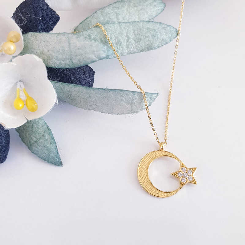 Silver Gold Crescent Star Women's Necklace We know that the Turkish flag takes its inspiration from the blood of martyrs and the crescent and star reflected in the bloodbath. This is an unmissable opportunity to carry the sacred meaning of the flag on your skin and share it with your loved ones. Crescent star necklace is made of 925 sterling silver. Gold plated on silver. Gold plated necklace models preserve their shine for a long time and oxidation is delayed. As with all necklace models, the crescent star women's necklace is produced by hand. Due to silver and precious stones, there may be ± 10% deviation in the average product weight. Width: 1.60 cm Length: 1.50 cm Avg. Weight: 1.50 gr.