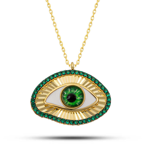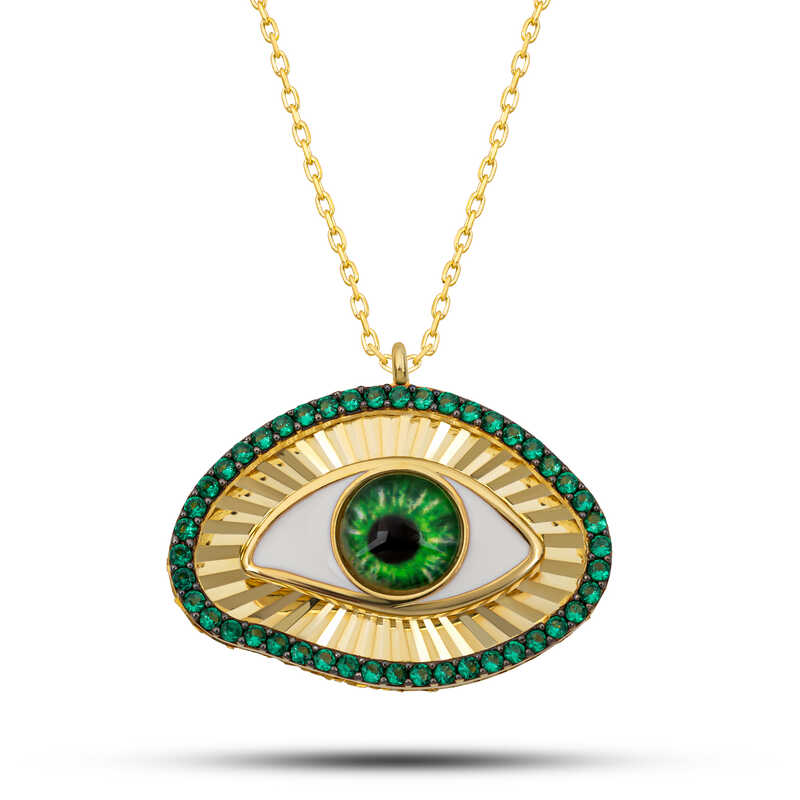 Silver Gold Emerald Eye Protection Women's Necklace Designed with the combination of elegance and mystical energy, the Silver Gold Emerald Eye Protection Women's Necklace stands out with its aesthetic elegance and offers a powerful symbol against bad energies. With gold-plated details and eye-catching emerald green stones, this special necklace allows you to reflect your style and carry a protective talisman. The green eye symbol symbolizes both harmony with nature and inner peace, while also aiming to protect from negative energy. This necklace, a modern interpretation of traditional evil eye bead culture, offers an impressive and elegant look. The stones on the necklace are zircon. Gold-plated silver products maintain their shine for a long time and oxidation is delayed. Like all silver necklaces, the gold emerald eye protection necklace is also entirely handmade. There is a ± 10% deviation in the stated average product weight due to silver and precious stones. can be. Width: 2.00 cm Length: 1.70 cm Average Weight: 4.20 gr. Chain Length: 45.00 cm