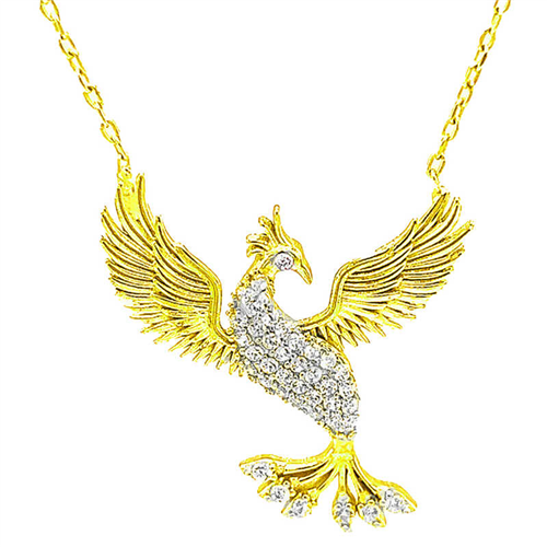 Silver Gold Emerald Phoenix Women's Necklace While similar characteristics are seen about the Phoenix in legends from different cultures, there are also quite different legends about it. The Phoenix, believed to have lived in the land of Abyssinia in ancient Greek mythology, is said to have a very long lifespan and to be slightly larger than an eagle. Although it is generally depicted differently in each culture, its common feature is said to be its fiery red color and its bright neck feathers. The only common feature about the Phoenix is that it is reborn by fire. Because of this feature, the Phoenix, which finds a wide place in many beliefs, is still the symbol of rebirth today. You can gift your loved ones the Silver Emerald Phoenix Necklace. This stylish necklace is made of 925 sterling silver. Gold-plated silver women's necklace models preserve their shine for a long time. All of our products are hand-made. Due to silver and precious stones, there may be ± 10% deviation from the average product weight. Width: 2.30 cm Height: 2.60 cm Average weight: 2.80 gr.