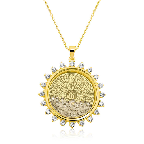 Silver Gold Esmaül Hüsna Women's Necklace Esmaül Hüsna is the name given to the ninety-nine names of Allah, which mean the most beautiful names. This wonderful necklace, with Esmaül Hüsna written on it and zircon stones inside, is made of 925 sterling silver. Gold-plated silver. Gold-plated silver necklace models preserve their shine for a long time. The chain that comes with the necklace is also silver and is 45 cm in length. This specially designed necklace is a perfect option as a birthday gift, Valentine's Day gift or a gift for mothers on special occasions. Like all our silver necklace models, the silver Esmaül Hüsna necklace model is handmade. Due to silver and precious stones, there may be a ± 10% deviation in the specified product weight. Width: 2.60 cm Length: 3.20 cm Average Weight: 7.50 gr.