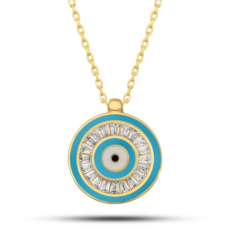 Silver Gold Evil Eye Bead Women's Necklace Add elegance to your style with this specially designed necklace where elegance and meaning come together. The evil eye bead necklace, made of gold-plated 925 sterling silver, has a dazzling appearance with blue and white enamel details. The evil eye figure, surrounded by elegant rings, is adorned with stones that reflect light in the best way, creating a sparkling effect. This necklace, which combines the traditional protective power of the evil eye bead with a modern design, is an ideal accessory for both daily use and special occasions. Gold-plated silver products preserve their shine for a long time and oxidation is delayed. Like all silver necklaces, the gold evil eye necklace is entirely handmade. Due to silver and precious stones, there may be a ± 10% deviation from the average product weight. Width: 1.50 cm Length: 1.50 cm Average Weight: 3.10 gr. Chain Length: 45.00 cm