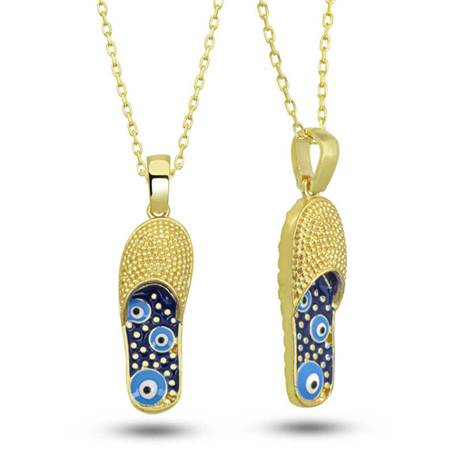 Silver Gold Evil Eye Covered Slippers Women's Necklace Evil eye beads have been used for many years to protect against evil gazes. The evil eye bead is a precaution against the negative effects of evil gazes on people. For this reason, people wear evil eye beads to protect their loved ones. This evil eye covered slippers women's necklace reflects elegance and style. You can choose this model, which has always been popular and does not compromise on its elegance, as a birthday gift, Valentine's Day gift or a gift for mothers on special occasions. The silver evil eye covered slippers women's necklace is made of 925 sterling silver. Gold plated silver. Gold plated silver women's necklaces preserve their shine for a long time and oxidation is delayed. Like all silver women's necklaces, this silver evil eye covered slippers women's necklace model is produced entirely by hand. Due to silver and precious stones, there may be a ± 10% deviation in the average product weight. Necklace Width: 0.80 cm Necklace Length: 2.60 cm Chain Length: 45 cm Average Weight: 3.00 gr.