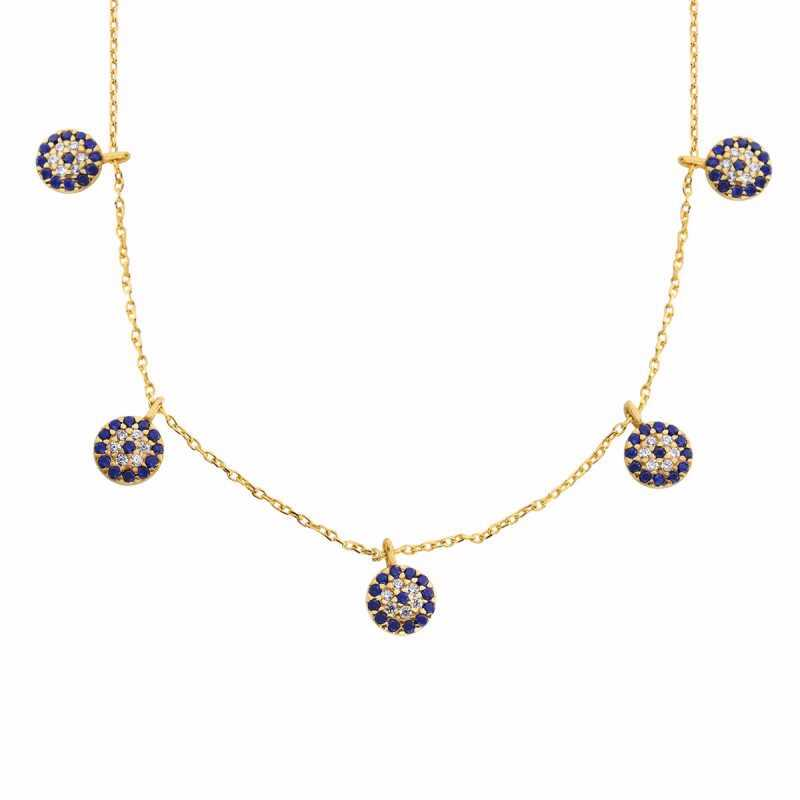 Silver Gold Evil Eye Luck Necklace for Women The silver evil eye bead is a model that you can easily use in daily life with its simple design. The evil eye bead protects you from evil eyes. The stones on this stylish silver necklace model are zircon. Gold plating is used to delay oxidation of the silver and preserve its shine for a long time. The average length of the chain, which is completely silver, is 45 cm. This evil eye luck necklace model is handmade. Due to silver and precious stones, there may be ± 10% deviation from the average product weight. Width: 0.70 cm Length: 0.70 cm Average weight: 3.50 gr