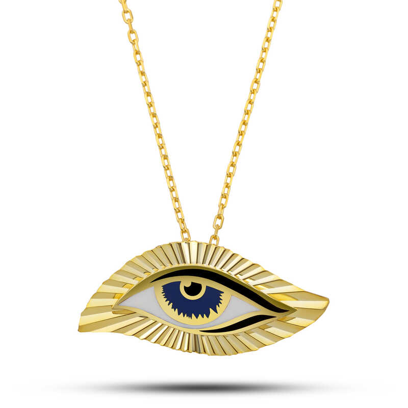 Silver Gold Eye of the Night Women's Necklace Deep navy blue gaze representing the night is combined with the sparkle of gold. The Silver Gold Eye of the Night Women's Necklace is a special design that combines elegance and mystical energy. The eye motif is known as a symbol of protective and intuitive powers in ancient cultures. This necklace carries both elegance and a powerful meaning around your neck. Inspired by the depth of the night, this unique necklace adds elegance to your daily style and protects you from negative energies. If you are looking for a meaningful gift for your loved ones or a special touch for yourself, the Eye of the Night is just for you. Gold-plated silver products preserve their shine for a long time and oxidation is delayed. Like all silver necklaces, the gold Eye of the Night necklace is entirely handmade. There may be a ± 10% deviation in the average product weight due to silver and precious stones. Width: 2.50 cm Length: 1.30 cm Average Weight: 2.90 gr. Chain Length: 45.00 cm