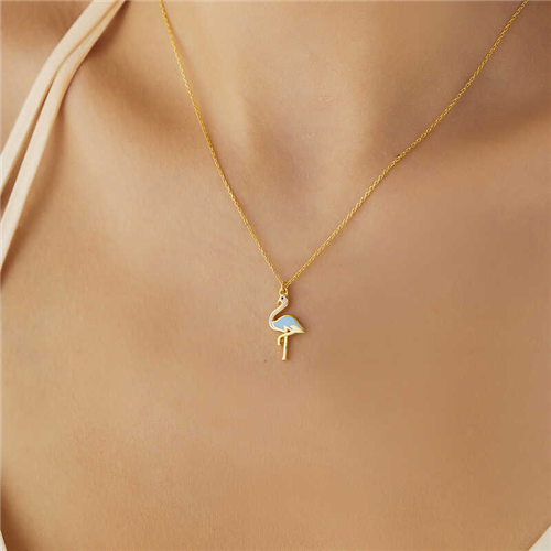 Silver Gold Flamingo Women's Necklace Flamingos, used in tattoos with the colors they carry due to their nature, are symbols of elegance and beauty. These meanings are common definitions for them, but they also mean spiritual guidance, freedom, love and nobility that their nature as birds brings. This makes them a stylish gift option. Gold plated on silver. Gold plated silver women's necklace models preserve their shine for a long time and oxidation is delayed. The chain that comes with the necklace is completely silver and is 45 cm long. Like all silver women's necklace models, the silver women's flamingo necklace model is entirely handmade. For this reason, there may be ± 10% deviation in the average product weight due to mines and precious stones. Width: 1.10 cm Height: 2.00 cm Average weight: 2.40 gr.