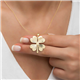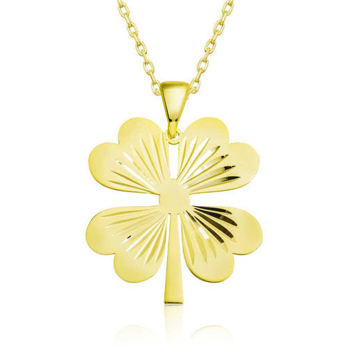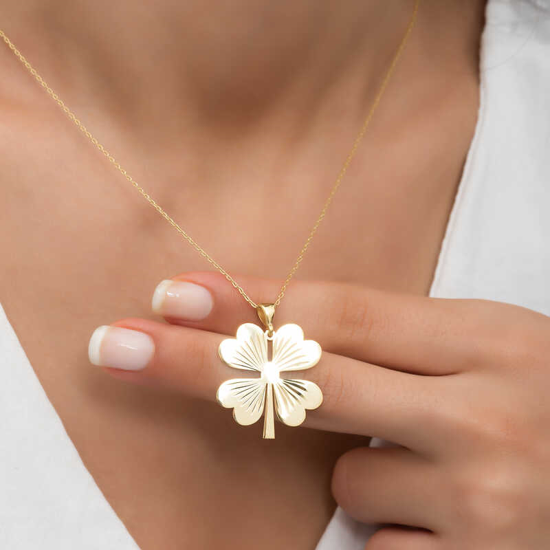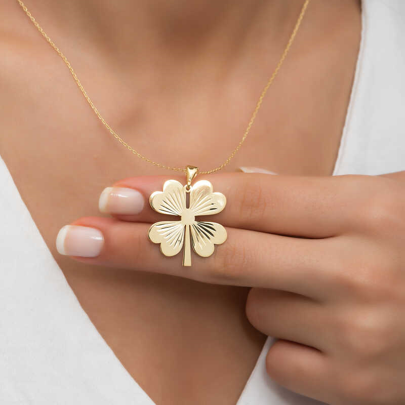 Silver Gold Four Leaf Gold Clover Women's Necklace The four-leaf clover is considered a symbol of good luck in all cultures. Each of the four leaves of the clover has a different meaning. The first leaf symbolizes hope, the second symbolizes faith, the third symbolizes love, and the fourth leaf symbolizes luck. You can carry your luck with you at all times or gift it to your loved ones. This specially designed women's necklace featuring a four-leaf clover is made of 925 sterling silver. Let your names come to life on the skin of the woman you love with the silver women's four-leaf clover necklace. This special necklace with a 45 cm long silver chain is a very stylish option for young lovers on special occasions. Adorn your loved one's neck with love with this special necklace. The silver women's four-leaf clover necklace is gold-plated. Gold-plated silver women's necklaces preserve their shine for a long time. This specially designed named necklace will be one of the most beautiful gifts that not only you but also your loved ones will enjoy wearing. Like all our silver women's necklace models, the silver women's four-leaf clover necklace is also handmade. Due to silver and precious stones, there may be a ± 10% deviation in the specified product weight. Width: 2.60 cm Length: 2.50 cm Average Weight: 4.10 gr. Chain length: 45.00 cm