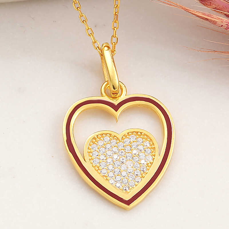 Silver Gold Heart Women's Necklace The heart symbol has always been the symbol of unconditional love and passion. In religious teachings, the power of the heart is limitless. Because the heart is the house of the Creator and our gateway to reality that opens to the universe. This stylish silver heart necklace is a perfect option for a birthday gift, Valentine's Day gift or a gift for mothers on special occasions. The silver heart women's necklace is made of 925 sterling silver. This necklace is gold-plated. Gold-plated silver women's necklace models preserve their shine for a long time. The stones on it are zircon. Like all our silver women's necklace models, the silver heart women's necklace model is handmade. Due to silver and precious stones, there may be a ± 10% deviation in the average product weight. Width: 1.80 cm Length: 2.20 cm Chain Length: 45 cm Avg. Weight: 3.50 gr.