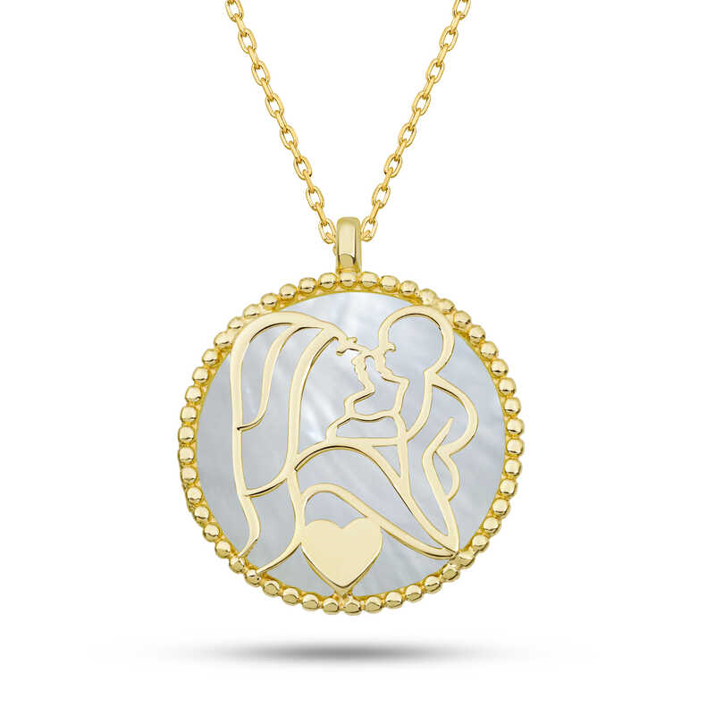 Silver Gold Mother-Child Love Necklace with Mother-Child Stone It is a special design that represents the love between the child and the mother. This necklace expresses the feelings of love, devotion and compassion. One of the most suitable gifts you can buy to show your devotion to your mother will be this mother and baby necklace. This specially designed mother-of-pearl stone mother-child necklace designed for your mother is made of 925 sterling silver. Gold plating is made on silver. Gold-plated silver mother child necklace models preserve their shine for a long time and oxidation is delayed. The average silver chain length is 45 cm. The silver mother child necklace is produced by hand. Due to silver and precious stones, there may be ± 10% deviation from the average product weight. Width: 1.80 cm Length: 2.00 cm Average Weight: 2.90 gr. Chain Length: 45.00 cm