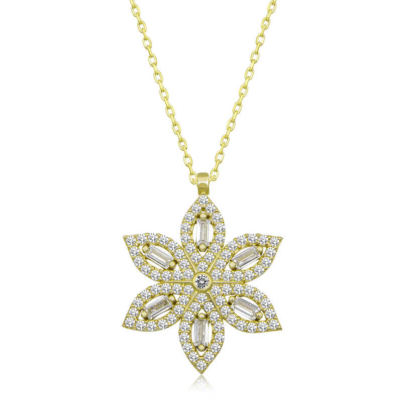 Silver Narcissus Flower Women's Necklace The most special and elegant way to express your feelings to your loved ones is through stylish, colorful, and fragrant flowers that you can send them. Because the narcissus means respect, it is one of the flowers that can be given to those you value and respect in your life. There are different types of narcissus. But they are all generally known and used as Narcissus. It is also known as the flower of beauty and love. The flower, which is among the gifts to be given on special occasions, this time found meaning with a silver necklace. The silver flower women's necklace crafted with the highest quality, brightest, and most sparkling stones is waiting for those who want to express their love once again, for those who want to say "you are a flower." This specially designed silver narcissus flower women's necklace is made of 925 sterling silver. Gold-plated silver. Gold-plated silver women's necklace models preserve their shine for a long time and oxidation is delayed. The white stones on the necklace are baguette and zircon. The average silver chain length is 45 cm. Like all women's silver necklace models, the silver narcissus flower women's necklace is also handmade. Due to silver and precious stones, there may be a ± 10% deviation in the specified product weight. Width: 1.80 cm Length: 2.30 cm Weight: 2.90 gr.