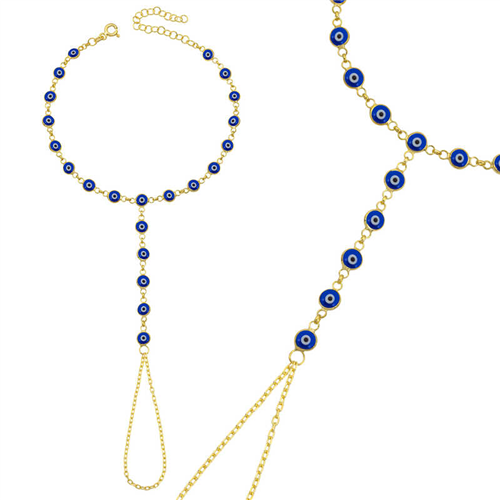 Silver Gold Navy Blue Evil Eye Beaded Shahmaran The Silver Gold Navy Blue Evil Eye Beaded Shahmaran, where modern design meets traditional symbols, brings elegance and style to your wrist. While it offers a dazzling shine with its gold-plated chain structure, the navy blue evil eye beads provide symbolic protection against bad energies. It creates a difference in both your daily and special day combinations with its elegant structure extending from your wrist to your finger. The Silver Gold Blue evil eye beaded Shahmaran is made of 925 sterling silver. Gold plating on silver ensures that it preserves its shine for a long time. All of our women's silver shahmaran models are handmade. There may be a ± 10% deviation in the average product weight due to silver and precious stones. Evil Eye Width: 0.40 mm Evil Eye Length: 0.40 mm Bracelet Length: 23.00 cm Average Weight: 3.40 gr.