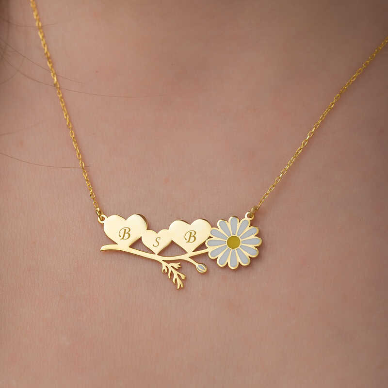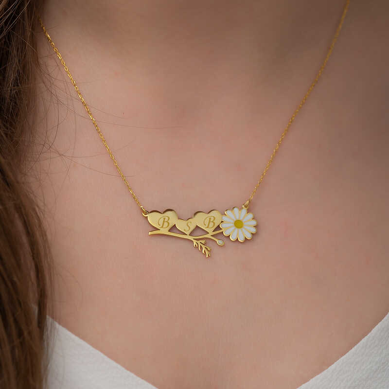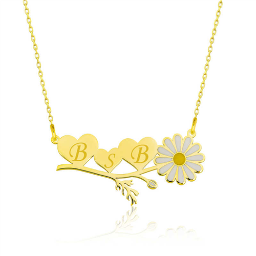 Silver Gold Personalized Heart Daisy Necklace Daisy flowers express the meaning of pure love. One of their most important features is that there is one on each stem. You can personalize the hearts with the initials of your loved one. A personalized heart daisy necklace is a perfect option for a birthday gift, Valentine's Day gift or a gift for mothers on special occasions. The silver daisy personalized heart women's necklace is made of 925 sterling silver. This necklace is gold plated. Gold plated silver women's necklace models preserve their shine for a long time and delays the tarnishing of the silver. As with all our silver women's necklace models, the silver personalized heart daisy women's necklace model is also handmade. Due to silver and precious stones, there may be a ± 10% deviation in the average product weight. Width: 3.60 cm Length: 1.60 cm Avg. Weight: 3.12 gr.