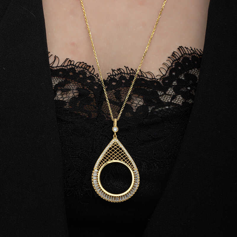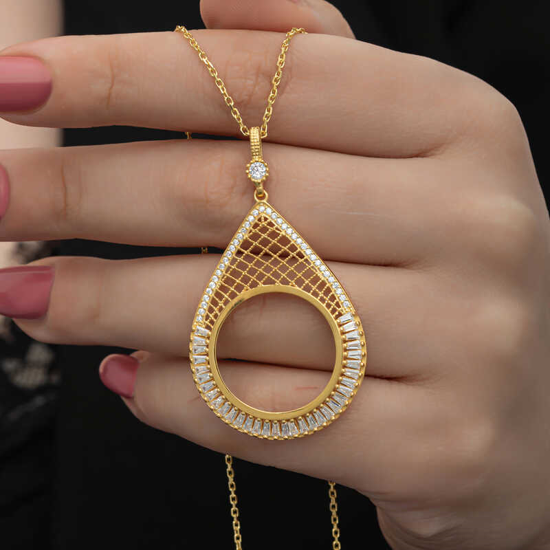 Silver Gold Plated Drop Half Gold Wearable Women's Necklace Let your love come to life on the skin of the woman you love with the silver half gold wearable necklace model that expresses elegance with its drop form pattern. Adorn your loved one's wrist with love with this women's necklace model that young lovers and those who feel young can choose on special occasions. A women's necklace that your loved ones will enjoy wearing as much as you will be one of the best gifts for your loved one. This women's necklace model is made of 925 sterling silver. Gold plated on silver. Gold plated silver women's necklace models preserve their shine for a long time and oxidation is delayed. The white stones on the necklace are zircon. Like all women's necklace models, the silver women's necklace model is produced by hand. Due to silver and precious stones, there may be a ± 10% deviation in the average product weight. Width: 2.90 cm Length: 4.10 cm Chain Length: 70 cm Average Weight: 8.00 gr.