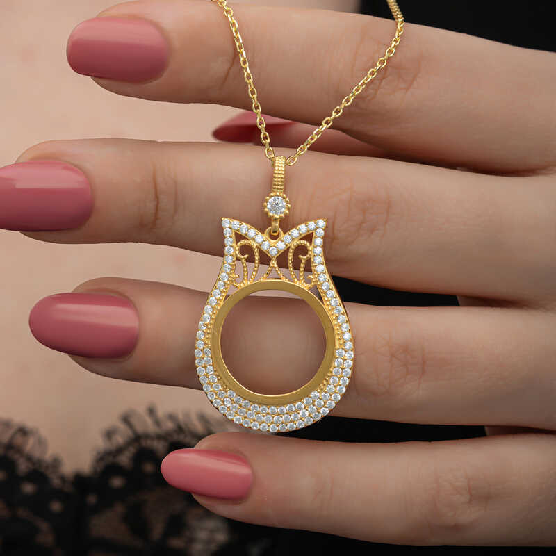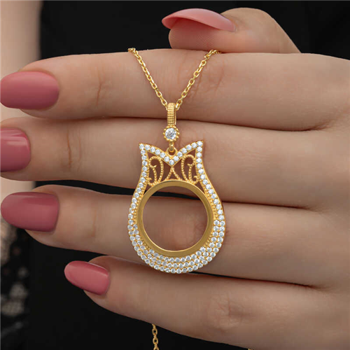 Silver Gold Plated Quarter Gold Women's Necklace Let your love come to life on the skin of the woman you love with this silver quarter gold plated necklace model that expresses elegance with its form pattern. Adorn your loved one's wrist with love with this women's necklace model that young lovers and those who feel young can choose on special occasions. A women's necklace that your loved ones will enjoy wearing as much as you will be one of the best gifts for your loved one. This women's necklace model is made of 925 sterling silver. Gold plated on silver. Gold plated silver women's necklace models preserve their shine for a long time and oxidation is delayed. The white stones on the necklace are zircon. Like all women's necklace models, the silver women's necklace model is produced by hand. Due to silver and precious stones, there may be a ± 10% deviation from the average product weight. Necklace Width: 2.40 cm Necklace Length: 3.10 cm Chain Length: 70 cm Average Weight: 7.60 gr.