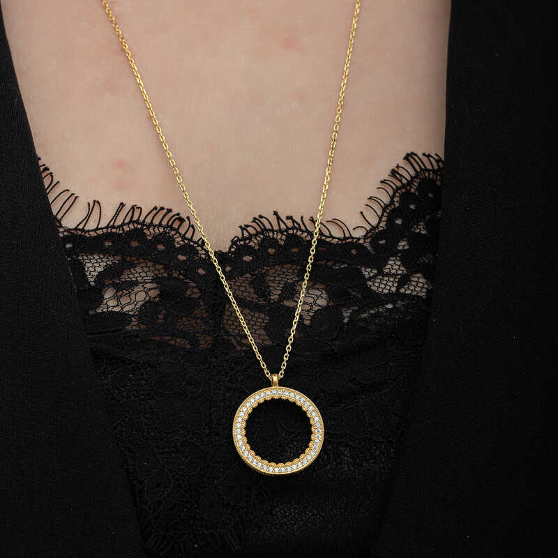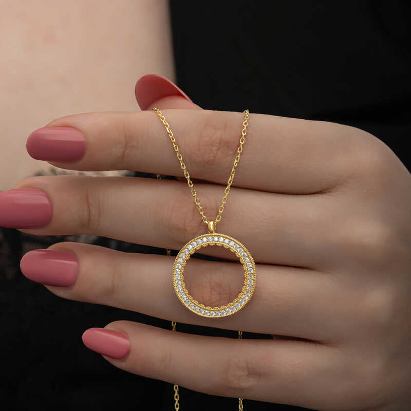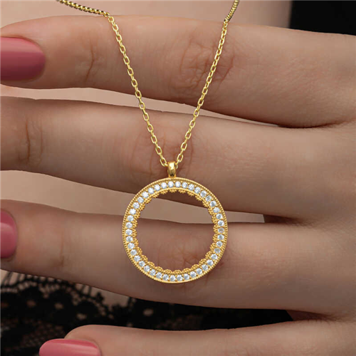 Silver Gold Plated Round Quarter Gold Necklace Let your love come to life on the skin of the woman you love with the silver quarter gold necklace model that expresses elegance with its round form pattern. Adorn your loved one's neck with love with this women's necklace model that young lovers and those who feel young can choose on special occasions. A women's necklace that your loved ones will enjoy wearing as much as you will be one of the best gifts for your loved one. This women's necklace model is made of 925 sterling silver. Gold plated on silver. Gold-plated silver women's necklace models preserve their shine for a long time and oxidation is delayed. The white stones on the necklace are zircon. Like all women's necklace models, the silver gold plated round quarter gold necklace model is produced by hand. Due to silver and precious stones, there may be a ± 10% deviation in the average product weight. Necklace Diameter: 2.20 cm Chain Length: 65 cm Average Weight: 7.60 gr.