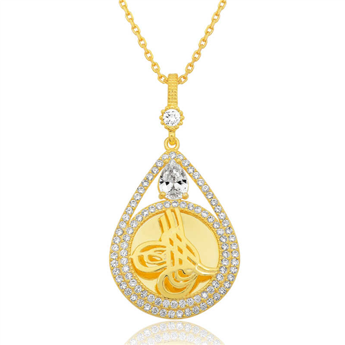 Silver Gold Plated Women's Necklace with Drop Tughra The tughra symbol, which was also used as a signature by the sultans in the Ottoman State and Empire, was combined with the drop necklace and became a necklace that expresses love with its meaning and its drop shape meaning half of the heart. Thus, you can delight your loved ones or yourself with this silver necklace, which has a religious and deep meaning. It is made of 925 sterling silver. Gold plated on silver. Gold plated silver women's necklace models preserve their shine for a long time and give the silver its golden color. The stones on it are zircon. The chain length is approximately 70 cm. All of our products are handmade. Due to silver and precious stones, there may be a ± 10% deviation in the average product weight. Width: 2.20 cm Length: 4.20 cm Chain Length: 70 cm Average Weight: 9.10 gr.
