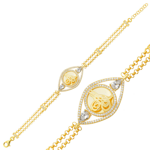 Silver and Gold Plated Women's Bracelet with TughraThe Tughra model, signed by the Ottoman sultans, is engraved on this specially designed women's bracelet model. It is made of 925 sterling silver. The white stones on the bracelet are zircon. Gold-plated silver. Gold-plated silver bracelet models maintain their shine for a long time. Thanks to the extension chain, it can be adjusted to fit any wrist size. As with all our women's bracelet models, this Tughra women's bracelet model is entirely handmade. Due to the silver and precious stones, there may be a ± 10% deviation from the average product weight.Width: 2.30 cmLength: 4.50 cmBracelet Length: 22 cmAverage Weight: 10.30 gr.