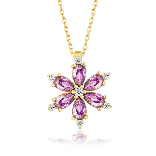 Silver Gold Purple Lotus Flower Women's Necklace The Lotus Flower is one of the most beautiful flowers that symbolizes spirituality, morality, and cleansing. The lotus flower, which blooms in the polluted waters of the rainforest, has managed to become a symbol of beliefs such as Buddhism and Hinduism with its beauty and purity. Moreover, the lotus flower is considered sacred in many ancient civilizations. Another detail that makes the lotus flower special is the region in which the flower grows. The lotus flower, which grows especially in swamps and muddy lands, can remain clean despite the polluted environment in which it grows. Able to clean even a single particle of dust that lands on it, the lotus flower greets those who encounter it with pure beauty. You can gift the Silver Purple Lotus Flower necklace, which is considered sacred in different cultures, to your loved ones or to treat yourself. This stylish necklace is a perfect option for a birthday gift, Valentine's Day or special occasions. The necklace is made of 925 sterling silver. The silver is gold-plated. Like other necklaces, the silver Purple lotus flower necklace is also handmade. Due to silver and precious stones, there may be a ± 10% deviation from the average product weight. Width: 1.70 cm Length: 2.00 cm Average Weight: 2.40 gr. Chain Length: 45.00 cm