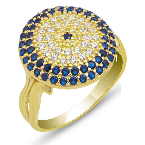 Silver Gold Round Evil Eye Women's RingStylish designs suitable for all ages and lifestyles, a model that will accompany you at any moment of the day. The evil eye bead will add beauty to your beauty. It will also keep you away from evil eyes. This evil eye women's ring is made of 925 sterling silver. Gold plated on silver. Gold plated silver women's ring models preserve their shine for a long time and oxidation is delayed. The stones on the ring are zircon. The silver round evil eye women's ring is produced by hand as well as other women's ring models. Due to silver and precious stones, there may be ± 10% deviation in the average product weight.Ring Width: 2.00 cmRing Length: 2.20 cm Avg. Weight: 4 gr.