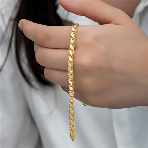 Silver Gold Sequined Chain Women's BraceletChain bracelets, the choice of women who want to look well-groomed in their daily lives, add elegance to even the simplest outfits. Sequined chain bracelets continue to impress with their elegance and chic. Chain bracelets, which can be used with any combination, from stylish to sporty, have a wide range of uses, allowing you to create your style freely. The silver sequined chain bracelet is gold-plated. Gold plating delays the tarnishing of the silver. As with all our silver models, the silver sequined chain bracelet model is produced entirely by hand. Due to silver and precious stones, there may be ± 10% deviation from the average product weight.Width: 0.50 mmBracelet Length: 19 cmAvg. Weight: 8.50 gr.