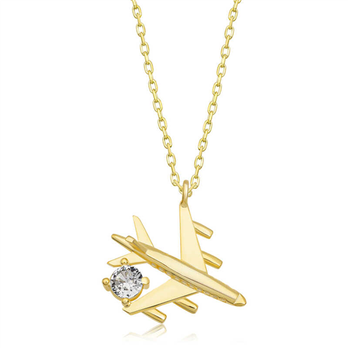 Silver Gold Single Stone Airplane Women's Necklace With silver airplane necklaces, those who are precious to you are always with you... The silver single stone airplane necklace that you and your loved ones will wear with pleasure will be one of the most meaningful gifts. The airplane women's necklace model is made of 925 sterling silver. Gold plating is done on silver. Gold-plated silver women's necklace models preserve their shine for a long time. As with all of our products, the silver single stone women's airplane necklace model is produced by hand. Due to silver and precious stones, there may be ± 10% deviation from the average product weight. Width: 1.80 cm Length: 1.90 cm Average Weight: 2.80 gr