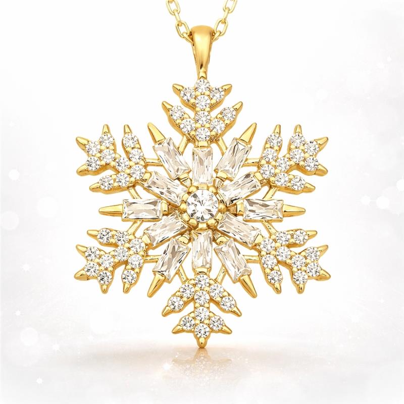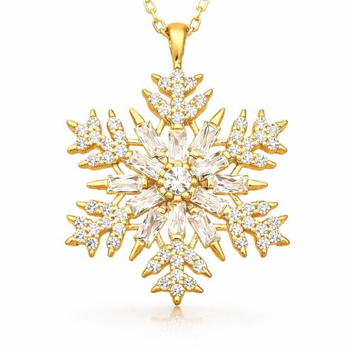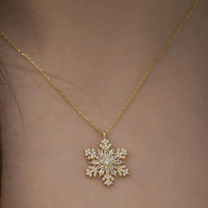 Silver Gold Snowflake Necklace The sparkle and clarity of women have been specially designed to resemble snowflakes. The fact that each snowflake is unique and has a different value, just like women, is another feature that makes them special. Their nobility has managed to attract attention in every period. Additionally, it symbolizes that people can live happily without hurting each other, just like snowflakes. This stylish necklace is a perfect option for a birthday gift, Valentine's Day gift or a gift for mothers on special occasions. The necklace is made of 925 sterling silver. Gold plated over silver. Gold plated products preserve their shine for a long time and oxidation is delayed. Like all silver women's necklaces, this silver gold snowflake women's necklace is entirely handmade. Due to silver and precious stones, there may be a ± 10% deviation in the average product weight. Width: 2.00 cm Length: 2.00 cm Average Weight: 3.15 gr. Chain Length: 45.00 cm