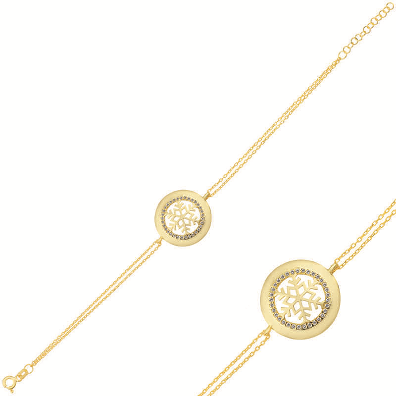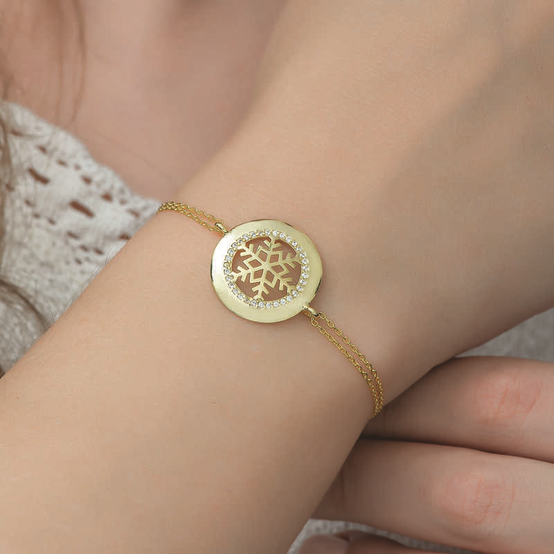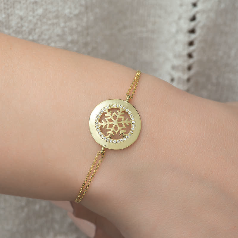 Silver Gold Snowflake Women's Bracelet The shine and clarity of women are likened to snowflakes. Snowflakes symbolize the person you love. The fact that each snowflake is unique and has a different value, like women, is another feature that makes them special. The nobility of the snowflake has managed to attract attention in every period. It also symbolizes that people, just like snowflakes, can live happily without hurting each other. This stylish and meaningful bracelet is a perfect option for a birthday gift, Valentine's Day gift, or a gift for mothers on special occasions. The bracelet is made of 925 sterling silver. Gold plated over silver. Gold plated products preserve their shine for a long time and oxidation of the product is delayed. Like all silver women's bracelets, this silver gold snowflake women's bracelet is entirely handmade. Due to silver and precious stones, there may be a ± 10% deviation in the average product weight. Width: 2.00 cm Length: 2.00 cm Average Weight: 2.45 gr.