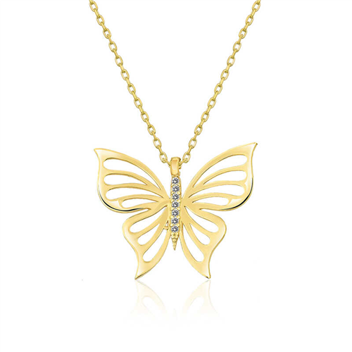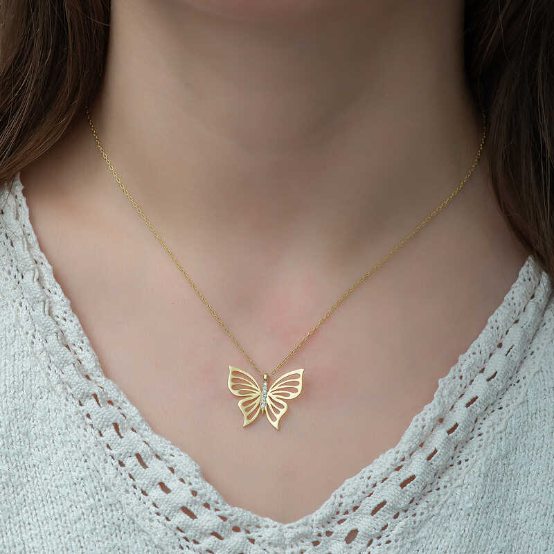 Silver Gold Spring Butterfly Women's Necklace Butterfly; is one of the most popular motifs preferred by women. It reminds its lovers of the mystery of nature and the richness of human imagination. Symbolizing freedom, innocence, and purity, the spring butterfly is the expression of pure affection and love. The spring butterfly women's necklace, which you and your loved ones will enjoy wearing, will be one of the best gifts for your loved one. The necklace is made of 925 sterling silver. Gold-plated silver women's necklaces preserve their shine for a long time and delay oxidation. The average silver chain length is 45 cm. Like all silver women's necklaces, the silver gold butterfly women's necklace model is also handmade. Due to silver and precious stones, there may be a ± 10% deviation in the average product weight. Width: 2.20 cm Length: 2.00 cm Weight: 2.25 gr.