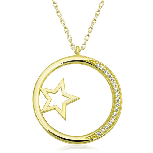 Silver and Gold Star Detailed Hoop Women's Necklace The star is an auspicious symbol believed to bring luck in many societies and teachings. It carries the energy of the Planet Venus. The Planet Venus is also the representative of the energy of love and romance. This stylish star necklace made of zircon stones is a perfect option for a birthday gift, Valentine's Day gift or for special occasions. Silver and gold zircon stone star women's necklace is made of 925 sterling silver. This necklace is gold plated. Gold plated silver women's necklace models preserve their shine for a long time. As with all our silver women's necklace models, the silver star detailed hoop women's necklace model is produced by hand. Due to silver and precious stones, there may be a ± 10% deviation in the average product weight. Width: 2.10 cm Length: 2.30 cm Average Weight: 2.70 gr. Chain Length: 45 cm