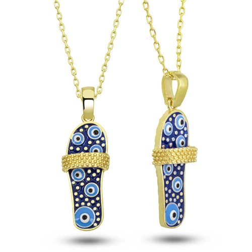 Silver Gold Striped Slippers Women's Necklace Evil eye beads have been used for many years to protect against evil eyes. The evil eye bead is a precaution against the negative effects of evil eyes on people. For this reason, people wear evil eye beads to protect their loved ones. This ribbon slippers women's necklace reflects elegance and style. You can choose this model, which has always been popular and does not compromise on its elegance, as a birthday gift, Valentine's Day gift, or a gift for mothers on special occasions. The silver evil eye ribbon slippers women's necklace is made of 925 sterling silver. Gold plated silver. Gold plated silver women's necklaces preserve their shine for a long time and oxidation is delayed. Like all silver women's necklaces, this silver evil eye ribbon slippers women's necklace model is produced entirely by hand. Due to silver and precious stones, there may be a ± 10% deviation in the average product weight. Necklace Width: 0.90 cm Necklace Length: 2.70 cm Chain Length: 45 cm Average Weight: 2.80 gr.