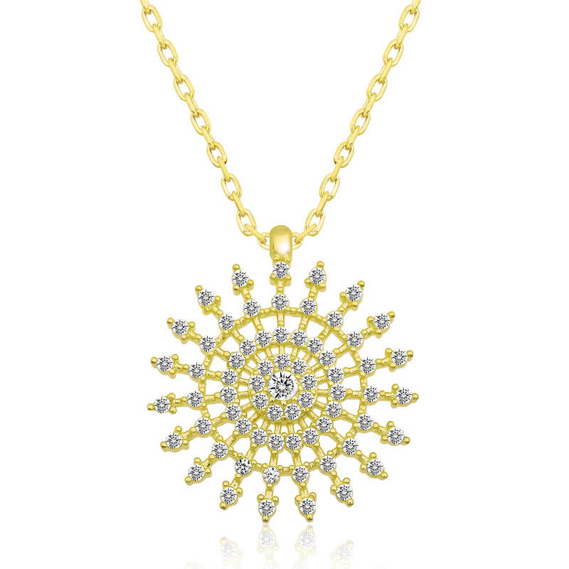 Silver Gold Sun Women's Necklace The sun is the symbol of light, knowledge, goodness, power, and management. This dazzling necklace with its sparkling and distinctive design is made of 925 sterling silver. Gold plating is applied to the silver. Gold-plated silver products preserve their shine for a long time and oxidation is delayed. The stones on the silver white stone sun women's necklace are zircon. Like all silver necklaces, the silver sun women's necklace is entirely handmade. Due to silver and precious stones, there may be ± 10% deviation in the average product weight. Width: 1.80 cm Length: 1.80 cm Average Weight: 2.50 gr.