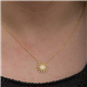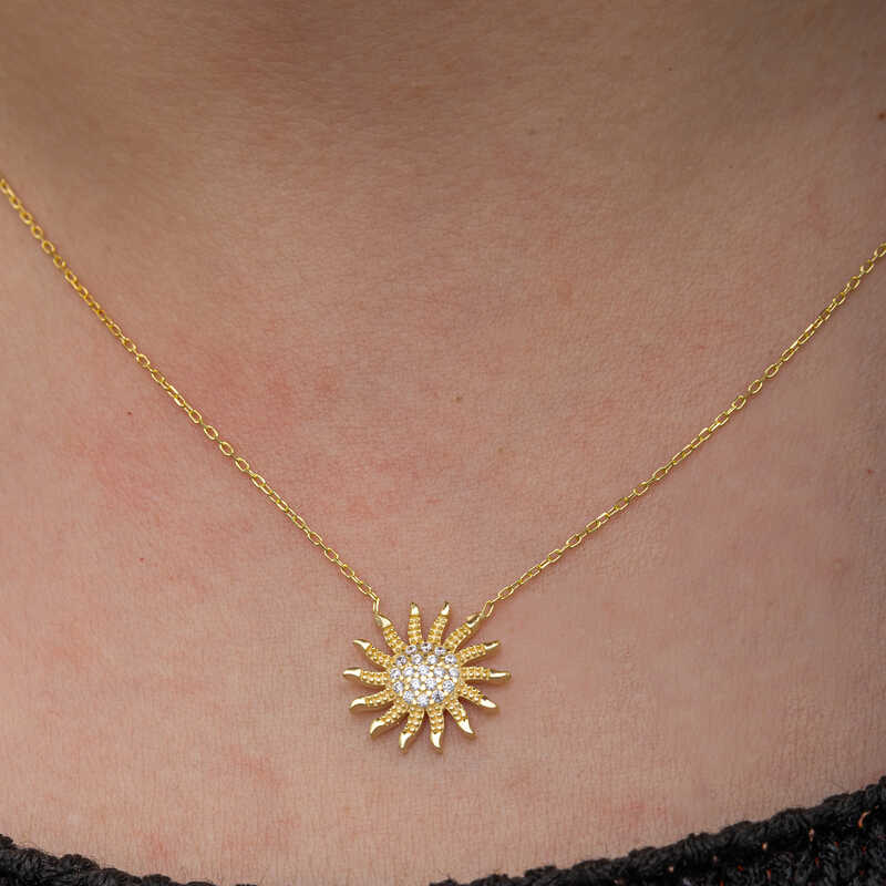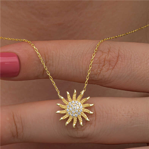 Silver Gold Sun Women's Necklace The sun is the symbol of light, knowledge, goodness, power, and management. This dazzling necklace with its sparkling and distinctive design is made of 925 sterling silver. Gold plating is applied to the silver. Gold-plated silver products preserve their shine for a long time and oxidation is delayed. The stones on the silver white stone sun women's necklace are zircon. Like all silver necklaces, the silver sun women's necklace is entirely handmade. Due to silver and precious stones, there may be a ± 10% deviation in the average product weight. Necklace Diameter: 1.50 cm Chain Length: 45 cm Average Weight: 2.50 gr.