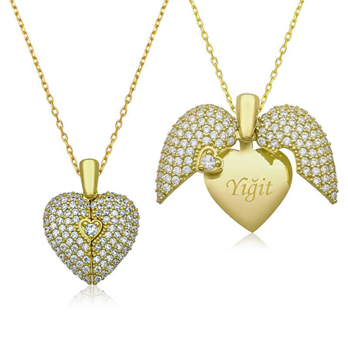 Silver Gold My Heart's Secret Necklace Translate your heart with the name written inside the heart that sparkles with zircon stones. The My Heart's Secret Necklace may be one of the best choices for you. The wings covered with white zircon stones, which will keep the names of your loved ones, the words that are most precious to you, or any other expression hidden, are designed to be used only when closed because the concept of secret is processed in the necklace. Your secrets are hidden under the wings. Among silver necklace models, the My Heart's Secret Necklace, which stands out with its suitability for both day and night, can be chosen either for yourself or for your loved ones. It is made of 925 sterling silver. The silver chain length is 45 cm. All of our products are handmade. Due to silver and precious stones, there may be a ± 10% deviation in the average product weight. Note: Please indicate the name you want to print in the notes section, returns cannot be accepted for personalized products. Width: 1.70 cm Length: 1.60 cm Average Weight: 4.56 gr.