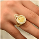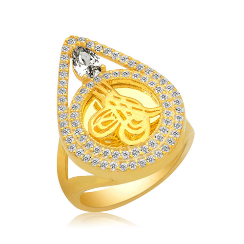 Silver Gold Tughra Women's RingThe Tughra symbol, also used as a signature by the sultans in the Ottoman State and Empire, has been combined with silver to create a meaningful necklace. Thus, you can delight your loved ones or yourself with this silver Tughra women's ring, which has a religious and deep meaning. The ring is made of 925 sterling silver. Gold plating is applied over the silver. Gold-plated silver women's ring models preserve their shine for a long time, giving the silver its golden color. The stones on the ring are zirconias. All of our products are handmade. Due to silver and precious stones, there may be a ± 10% deviation from the average product weight.Width: 2.10 cm Length: 2.30 cm Weight : 6.50 gr.
