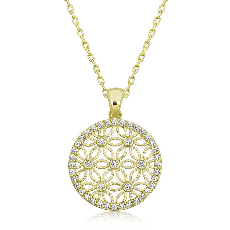 Silver Gold White Stone Flower of Life Women's NecklaceThe flower of life is the only geometric shape that contains all the secrets and knowledge of creation. In reality, it is not a circle but a sphere. It should be thought of as three-dimensional or even multi-dimensional. The flower of life contains Plato's 5 solids and Metatron's cube. These shapes construct all of existence. Considered one of the most powerful and special symbols in ancient teachings, the flower of life is the essence of the power of eternity, perfection, and excellence. You can delight your loved ones or yourself with this special necklace. The flower of life women's necklace model is made of 925 sterling silver. Gold-plated silver. Gold-plated silver women's necklace models preserve their shine for a long time and oxidation is delayed. The stones on the necklace are zircon. The average silver chain length is 45 cm. This flower of life women's necklace model is handmade like other silver women's necklace models. Due to silver and precious stones, there may be a ± 10% deviation in the average product weight.Width: 1.80 cmLength: 2.50 cmAverage Weight: 3.50 gr.