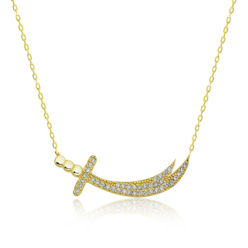 Silver Gold Zulfiqar Sword Women's Necklace According to historians, the Malik of Egypt Mukavkas gave this sword as a gift to the Prophet Muhammad. When Amru bin Adud wanted a warrior to oppose him in battle, the Prophet gave this sword to Ali and allowed him to face him. It is said that Hz. Ali killed nine of the leading warriors of the Quraysh in the Battle of Uhud and that he defended Hz. Muhammad until the last moment, receiving seventy wounds in this battle. For this reason, Gabriel said, “There is no sword sharper than Zulfiqar and no hero greater than Ali.” It is narrated that he said, "There is no fata but Ali, there is no seyfe but Zulfikar." It is stated that he was thrown into the sea in Najaf upon Ali's will. Zulfikar sword women's necklace model is made of 925 sterling silver. Gold plating is done on silver. Gold-plated silver women's necklace models preserve their shine for a long time. As with all of our products, the silver zulfikar sword women's necklace model is also produced by hand. Due to silver and precious stones, there may be ± 10% deviation from the average product weight. Width: 3.50 cm. Length: 1.00 cm. Average Weight: 2.50 gr.