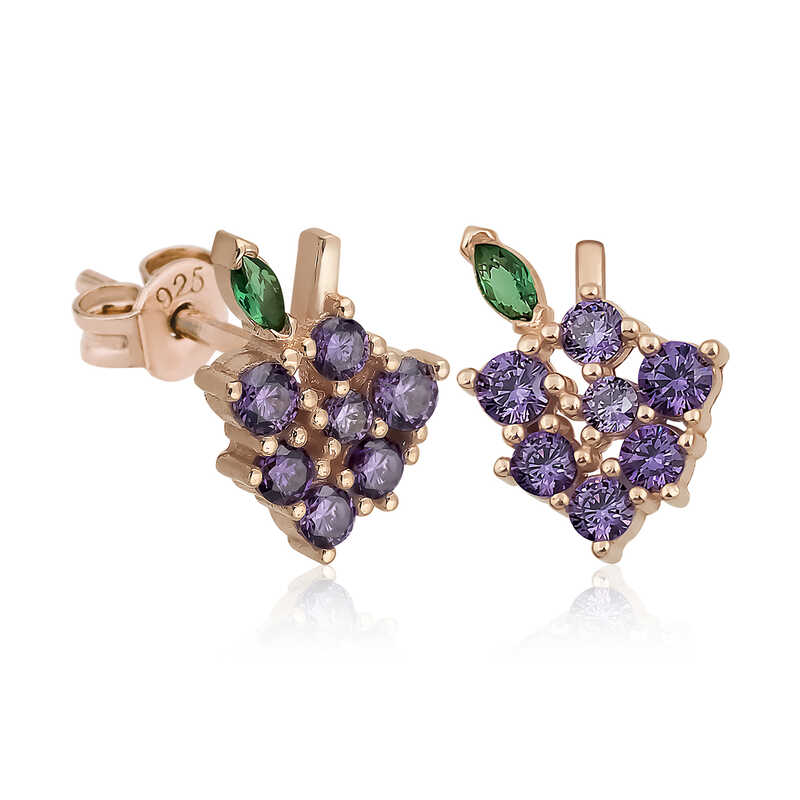 Silver Grape Figured Fruit Nail EarringsThe most preferred accessories of the summer season will be among your favorites with their colorful fruit concept. Fruit concept accessories will be the most talked about earrings of the summer and will add color to your daily style. These stylish grape figure earrings are a perfect option for a birthday gift, Valentine's Day gift or on special occasions. Silver zircon stone grape figured fruit nail earrings are made of 925 sterling silver. Rose plated on these earrings. Rose plated products preserve their shine for a long time and delay oxidation. Like all silver women's earring models, the silver grape figured fruit earring model is produced by hand. Due to silver and precious stones, there may be a ± 10% deviation in the average product weight.Width: 0.80 cmLength: 1.00 cmAverage Weight: 1.70 gr.
