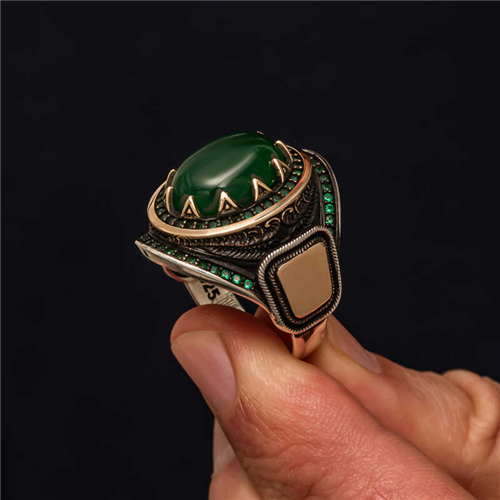 Silver Green Agate Stone Men's Ring Green agate represents health, luck and balance. It is also thought to be beneficial for mental clarity and emotional balance. These rings are expected to give courage, confidence and inner peace to the wearer. The use of green agate in men's rings is also important in terms of expressing personal style and power. You can give it to yourself or your loved ones on your birthday, Father's Day or special occasions. Oxidized silver is coated. Oxidized silver men's ring models preserve their shine for a long time and oxidation is delayed. Due to silver and precious stones, there may be ± 10% deviation from the average product weight. Ring Width: 2.00 gr Ring Length: 2.20 gr Avg. Weight: 17.00 gr.