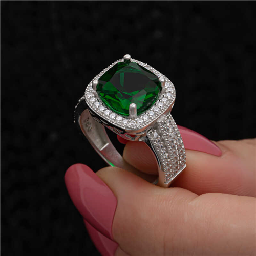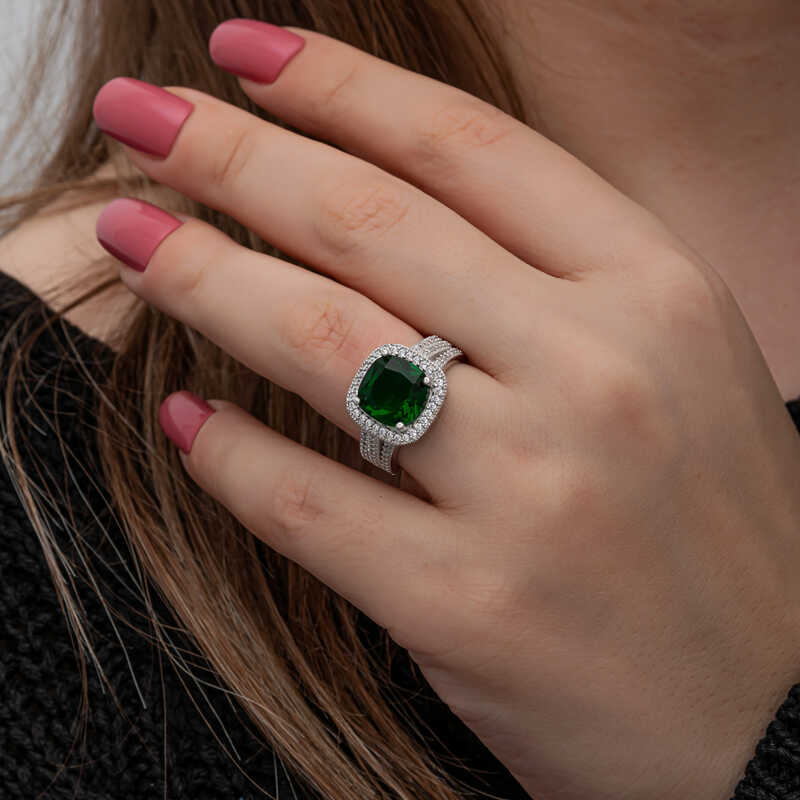 Silver Green Baguette Square Women's RingThis specially designed baguette square ring, which you can use easily in daily life, is made of 925 sterling silver. Rhodium plated silver. Rhodium plated women's silver ring models preserve their shine for a long time and oxidation is delayed. The stones on the ring are zircon. It is a perfect gift option for your loved one on birthdays, Valentine's Day and special occasions. As with all of our silver women's ring models, this baguette cut women's ring is also produced entirely by hand. Due to silver and precious stones, there may be ± 10% deviation from the average product weight.Width: 2.10 cm.Length: 2.40 cm.Avg. Weight: 4.70 gr.