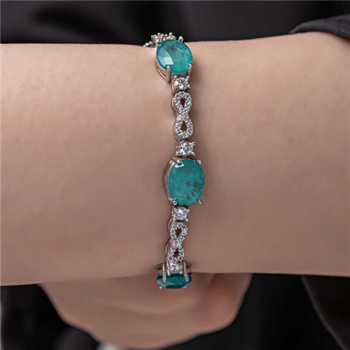 Silver Green Paraiba Stone Infinity Women's BraceletOne of the most beautiful and meaningful ways to express eternal love to your loved one is to gift her infinity-themed silver jewelry. With this special bracelet you will gift your loved one, you can express your eternal love and send the message that you will be together forever. The green paraiba stone infinity women's bracelet is made of 925 sterling silver. Rhodium plated silver. Rhodium plated silver women's bracelet models preserve their shine for a long time and oxidation is delayed. The stones on the bracelet are zircon. As with all silver women's bracelet models, the silver green paraiba stone infinity women's bracelet model is also handmade. Due to silver and precious stones, there may be a ± 10% deviation in the average product weight. Bracelet Infinity Width: 0.50 cmBracelet Infinity Length: 1.00 cm Bracelet Length: 23 cmAverage Weight: 8.50 gr.