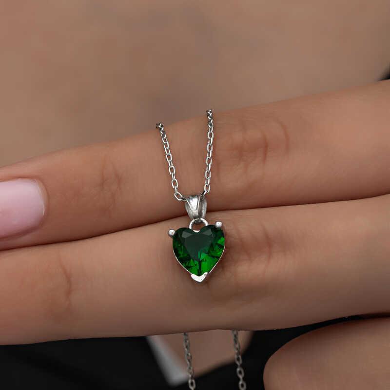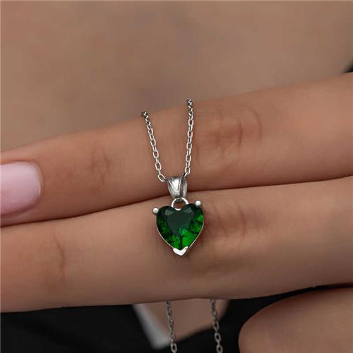 Silver Green Stone Heart Women's Necklace Let your love come to life on the skin of the woman you love with the heart necklace model that expresses love with its heart pattern. Adorn your loved one with love with this heart women's necklace that young lovers and those who feel young can choose on special occasions. A heart patterned necklace that your loved ones will enjoy wearing as much as you do will be one of the best gifts for your loved one. The heart women's necklace is made of 925 sterling silver. Rhodium plated silver. Rhodium plated silver women's heart necklaces preserve their shine for a long time and oxidation is delayed. The stone on the necklace is zircon. The average silver chain length is 50 cm. Like all women's necklaces, the silver green stone heart women's necklace is also handmade. Due to silver and precious stones, there may be ± 10% deviation in the average product weight. Necklace Width: 0.90 cm Necklace Length: 1.10 cm Chain Length: 50 cm Average Weight: 2.90 gr