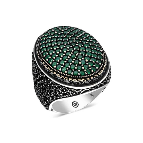 Silver Green Zircon Stone Oval Men's Ring This men's ring model, made of zircon green stone stones on silver, is a stylish accessory that you can use at any time of the day. You can gift this ring to yourself or your loved ones on your birthday, Father's Day or special occasions. The green stone men's ring model is made of 925 sterling silver. Oxide coating is applied on the silver. Oxide coated silver men's ring models preserve their shine for a long time. As with all men's rings, the silver zircon green stone men's ring model is also handmade. Due to silver and precious stones, there may be ± 10% deviation in the average product weight.Width: 2.50 cmLength: 3.00 cmAvg. Weight: 24.00 gr.