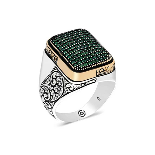 Silver Green Zircon Stone Square Men's Ring This men's ring model, made of zircon green stone stones on silver, is a stylish accessory that you can use at any time of the day. You can gift this ring to yourself or your loved ones on your birthday, Father's Day or special occasions. The green stone men's ring model is made of 925 sterling silver. Oxide coating is applied on the silver. Oxide coated silver men's ring models preserve their shine for a long time. As with all men's rings, the silver zircon green stone men's ring model is produced by hand. Due to silver and precious stones, there may be ± 10% deviation in the average product weight.Width: 2.30 cmLength: 2.90 cmAvg. Weight: 16.50 gr.