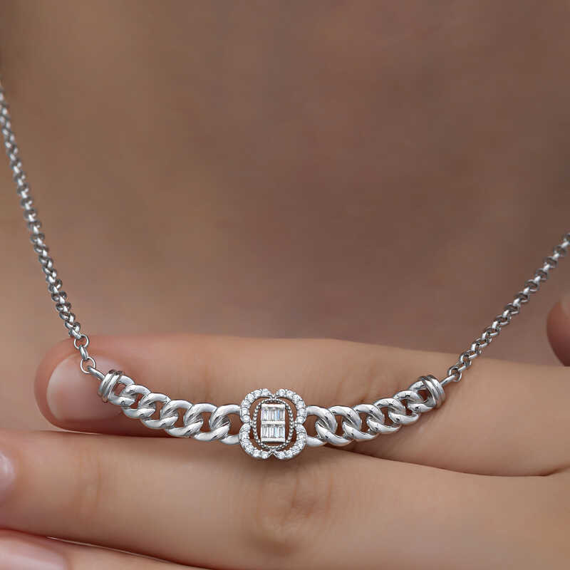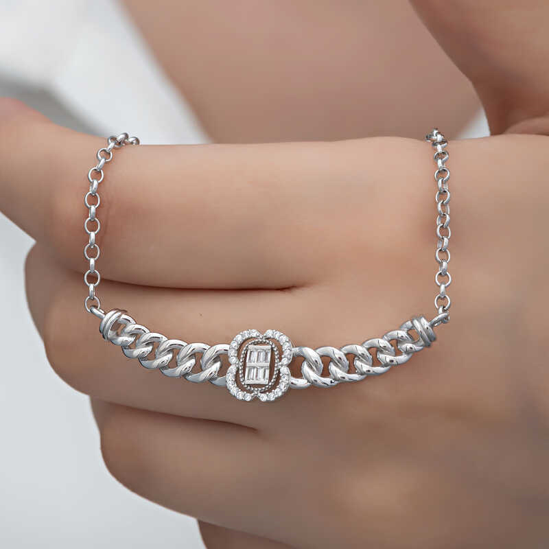 Silver Gourmet Chain Baguette Stone Women's Necklace The round baguette stone women's necklace, which will never go out of fashion, is reinterpreted in different styles with today's jewelry. The eye-catching sparkle of zircon will surround you. This silver and white baguette stone women's necklace, which you and your loved ones will enjoy wearing, will also be one of the best gifts to share your love. The product is made of 925 sterling silver. Rhodium plated on silver. Rhodium plated products preserve their shine for a long time and oxidation is delayed. The average chain length is 45 cm. The stones on it are zircon and baguette. As with all silver necklaces, the silver gurmet chain baguette stone women's necklace is also handmade. Due to silver and precious stones, there may be a ± 10% deviation in the average product weight. Width: 0.90 cm Length: 5.000 cm Average Weight: 6.00 gr.