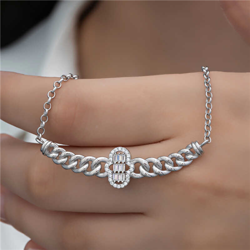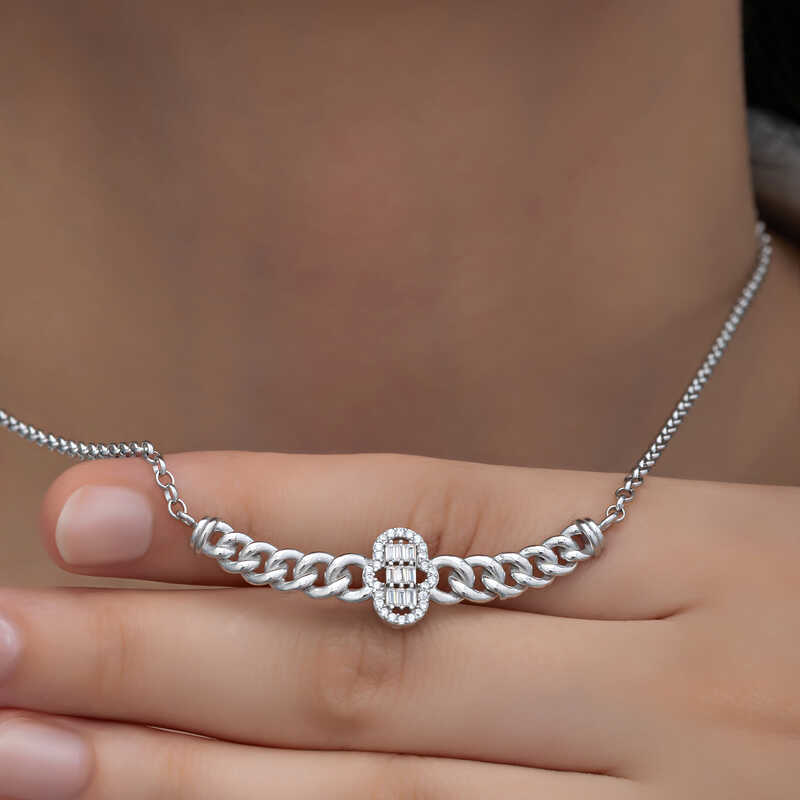 Silver Gurmet Chain Fatima's Hand Baguette Stone Women's Necklace The round baguette stone women's necklace, which will never go out of fashion, is reinterpreted in different styles with today's jewelry. The eye-catching sparkle of zircon will surround you. This silver and white baguette stone women's necklace, which you and your loved ones will enjoy wearing, will also be one of the best gifts to share your love. The product is made of 925 sterling silver. Rhodium plated on silver. Rhodium plated products preserve their shine for a long time and oxidation is delayed. The average chain length is 45 cm. The stones on it are zircon and baguette. As with all silver necklaces, the silver gurmet chained Fatima hand baguette stone women's necklace is also handmade. Due to silver and precious stones, there may be a ± 10% deviation in the average product weight. Width: 0.80 cm Length: 5.000 cm Average Weight: 6.00 gr.