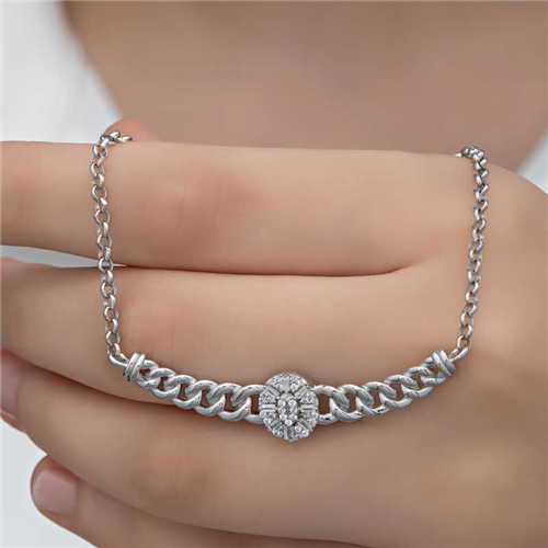 Silver Gourmet Chain Oval Baguette Stone Women's Necklace The oval baguette stone women's necklace, which will never go out of fashion, is reinterpreted in different styles with today's jewelry. The eye-catching sparkle of zircon will surround you. This silver and white oval baguette stone women's necklace, which you and your loved ones will enjoy wearing, will also be one of the best gifts to share your love. The product is made of 925 sterling silver. Rhodium plated on silver. Rhodium plated products preserve their shine for a long time and oxidation is delayed. The average chain length is 45 cm. The stones on it are zircon and baguette. As with all silver necklaces, the silver gurmet chain baguette stone women's necklace is also handmade. Due to silver and precious stones, there may be a ± 10% deviation in the average product weight. Width: 1.00 cm Length: 5.000 cm Average Weight: 6.00 gr.